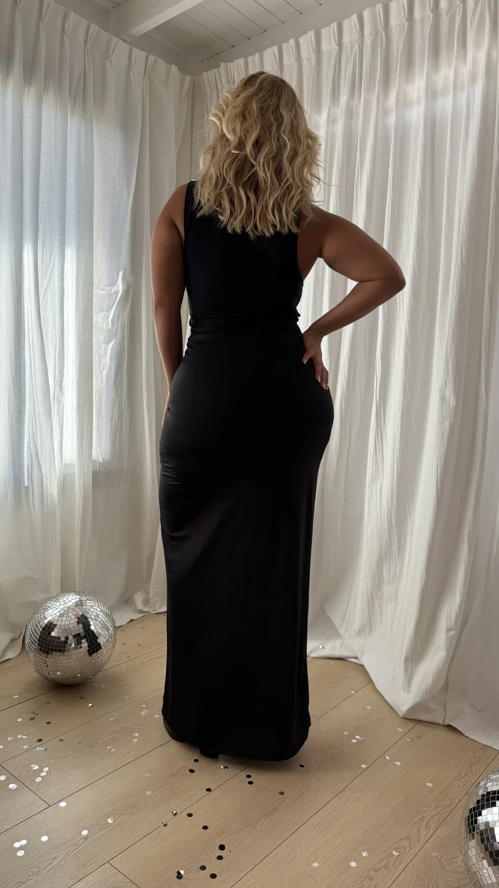 DETALLES: RECORTE EN CINTURA - BUSTO DE PAILLETTE CON FORRO INTERNO - ESCOTE PROFUNDO DE MICROTUL - TAJO CON JATERA REGULABLE EN FALDA - SIN MANGAS